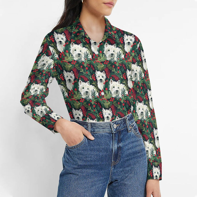 Amid a tapestry of emerald greenery, the bright-eyed West Highland White Terriers are like living ornaments, enhancing the holiday cheer. This shirt captures the essence of winter's lushness and the comforting presence of our furry friends during the festive season.