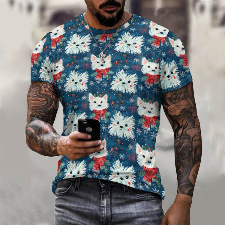 Celebrate the holiday season with the Frosty Whiskers Westie Christmas Men's Cotton T-Shirt, a perfect gift for Westie lovers.