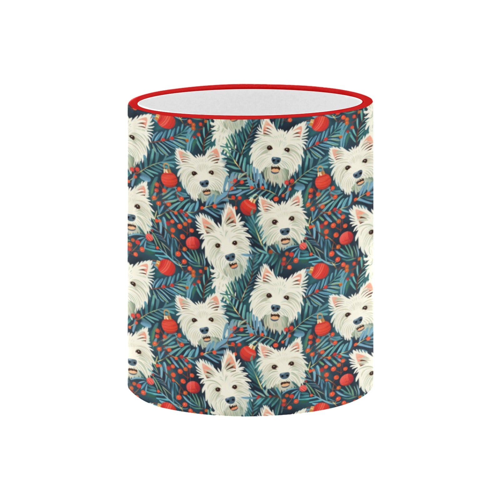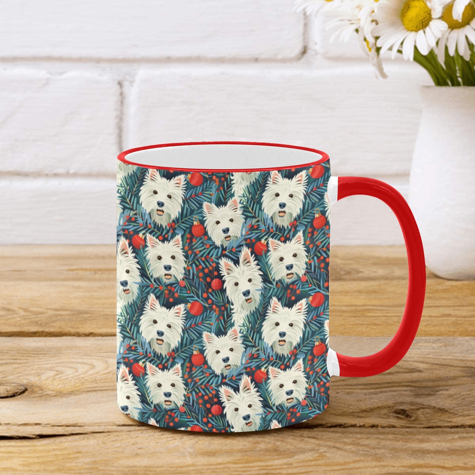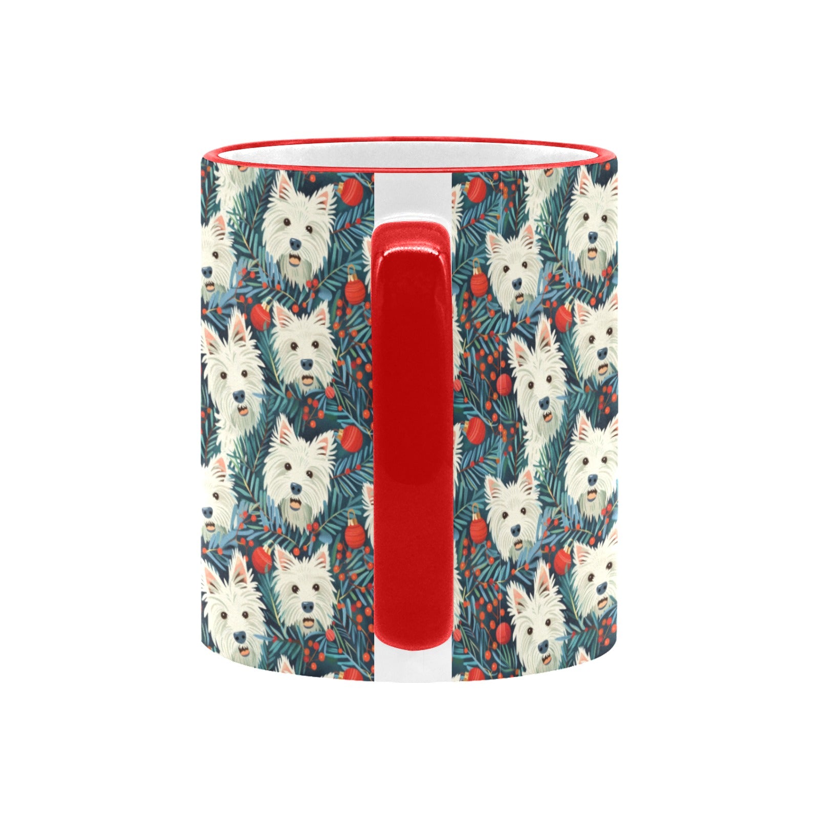 This charming mug features spirited West Highland Terriers against a festive wintry backdrop, capturing the essence of joy and togetherness.