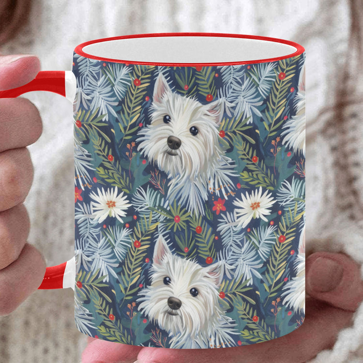 This delightful mug features a West Highland White Terrier, capturing the essence of winter's beauty and the love we share with our furry friends.