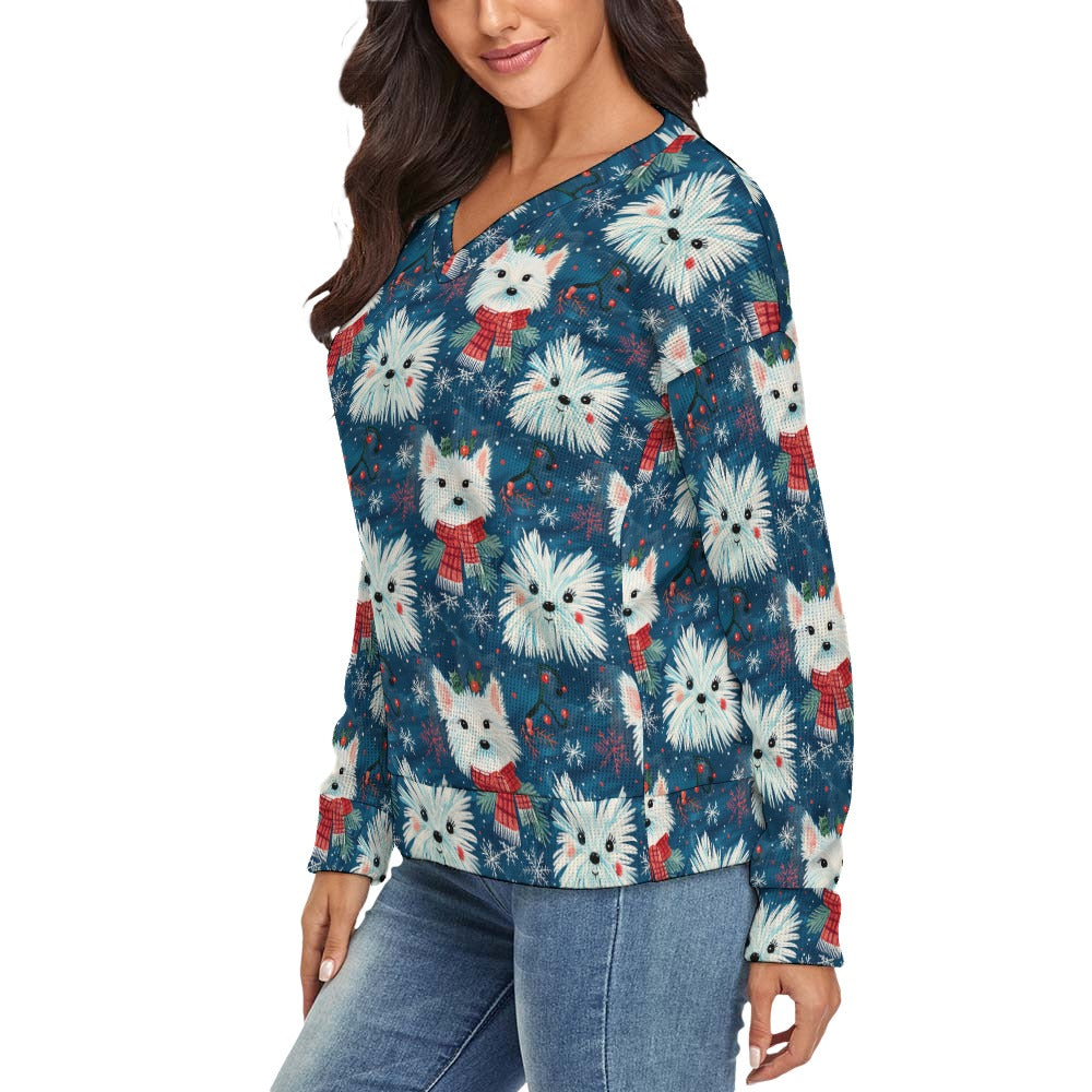 Frosty Whiskers Westie Women's V-Neck Christmas Sweater