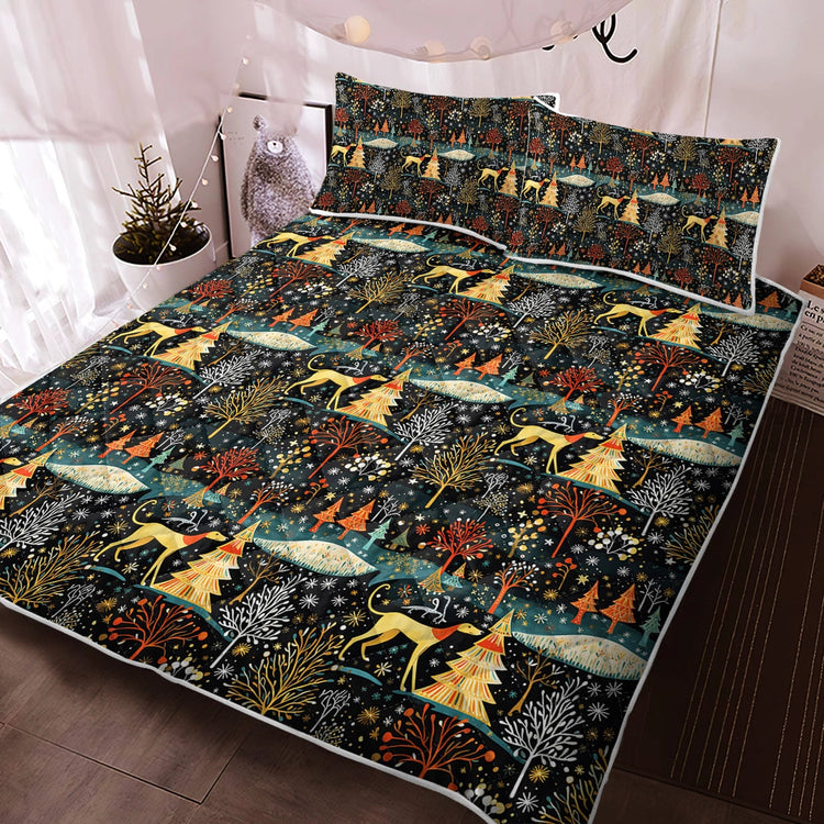 Wrap yourself in the magic of winter with our Starry Winter Walk Greyhound / Whippet Christmas Quilt Blanket Bedding Set.
