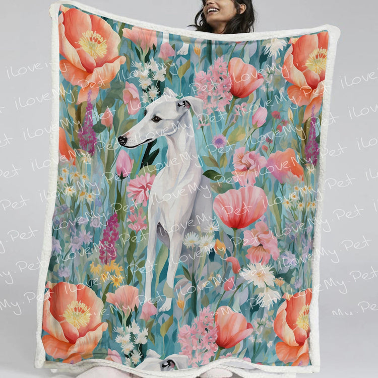 Wrap yourself in the transcendent beauty of our White Greyhound / Whippet in Floral Bloom Fleece Blanket.