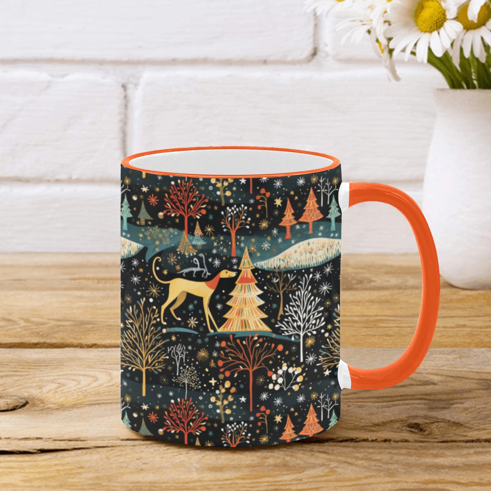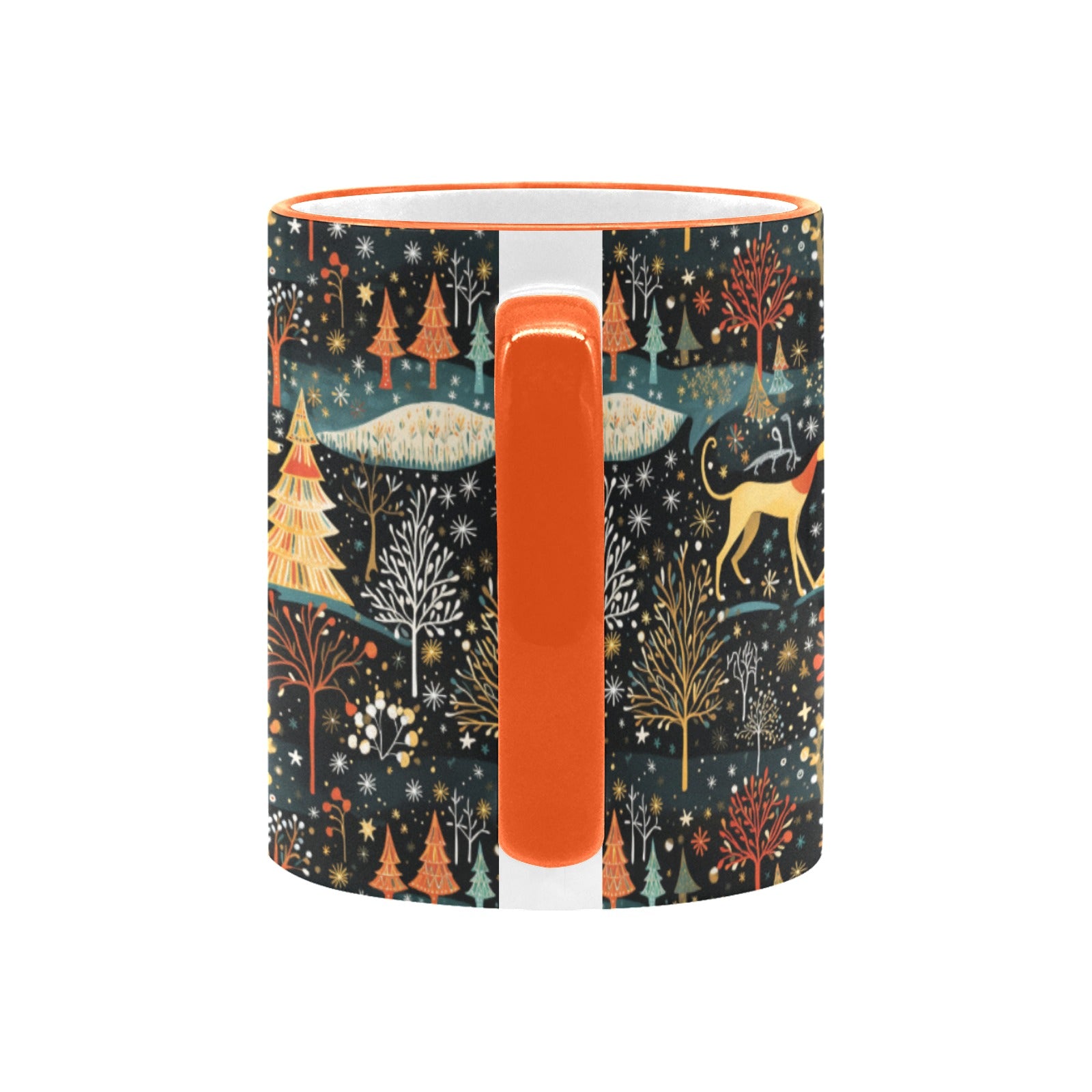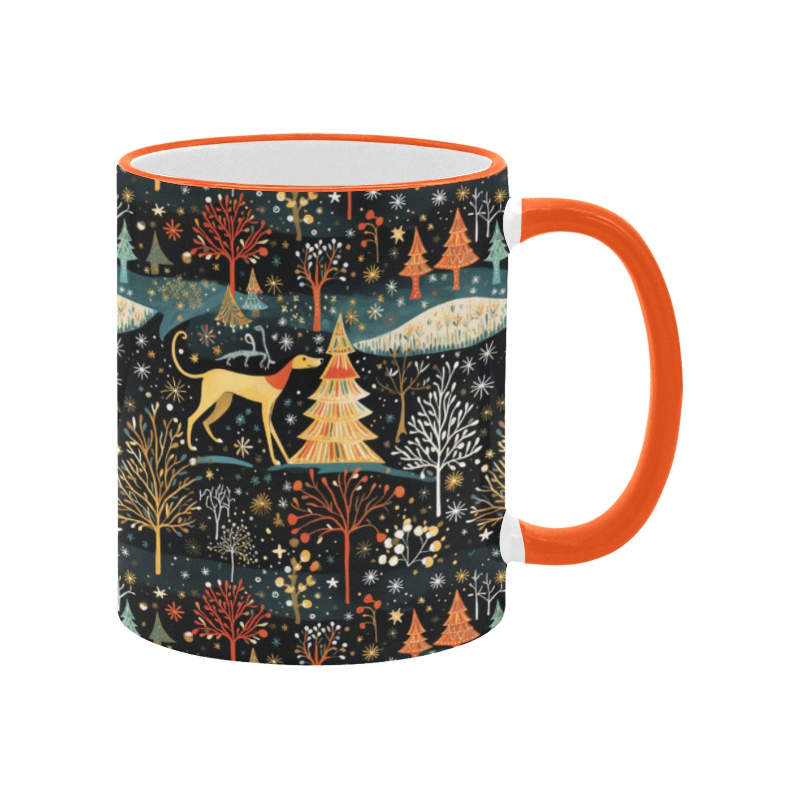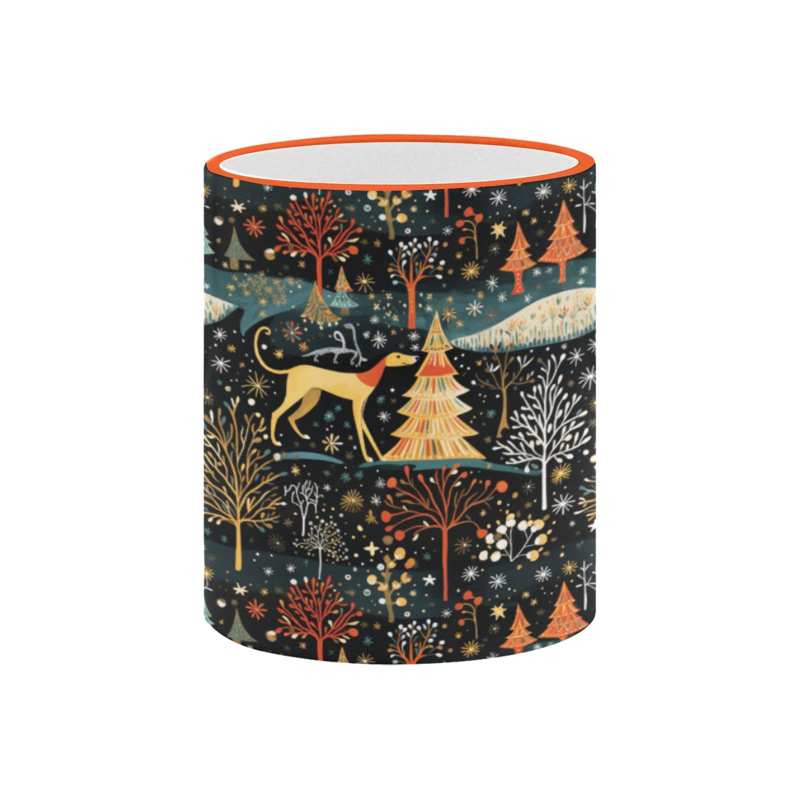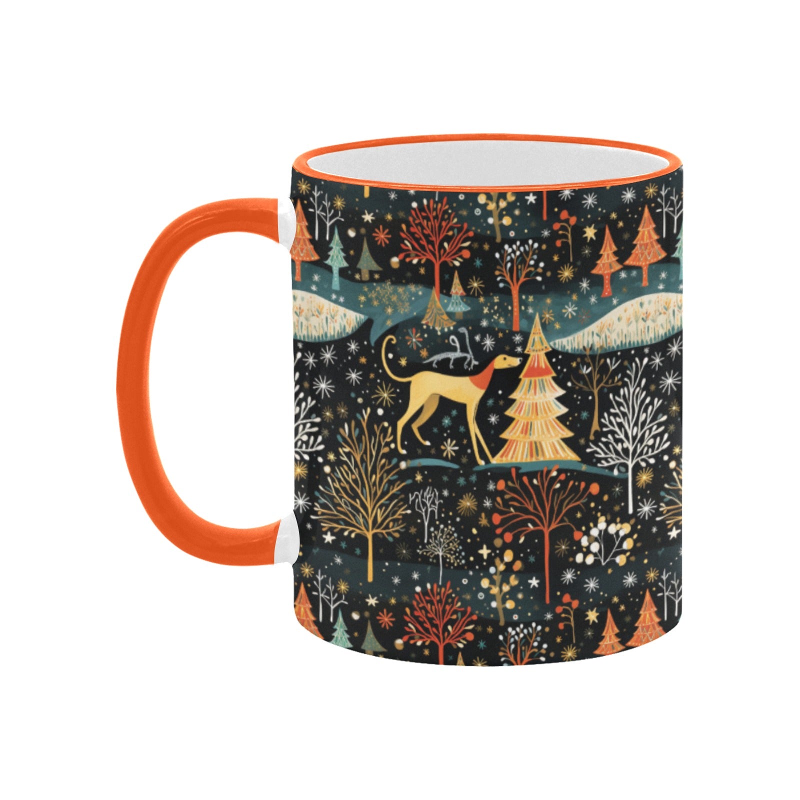 Embrace the magic of winter with our Starry Winter Walk Greyhound / Whippet Christmas mug, a perfect companion for cozy moments.