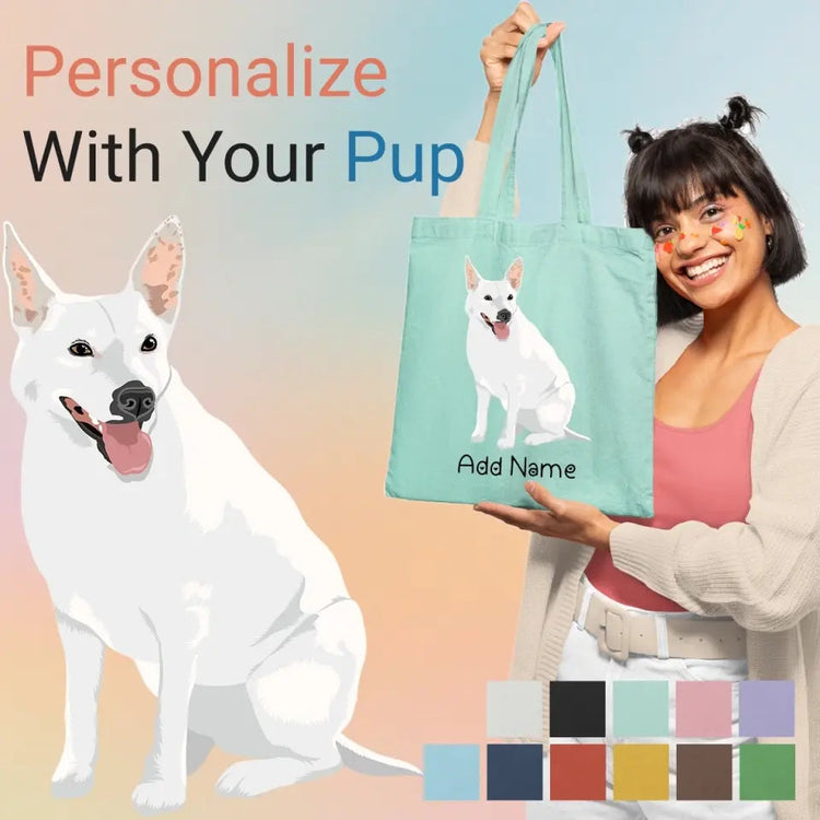 Personalize with your pup's name! Featuring the most adorable White Swiss Shepherd artwork, this tote bag is perfect for daily use. The canvas material, a cotton and polyester blend, ensures durability and style. Available in 11 colors with a safety zip closure.