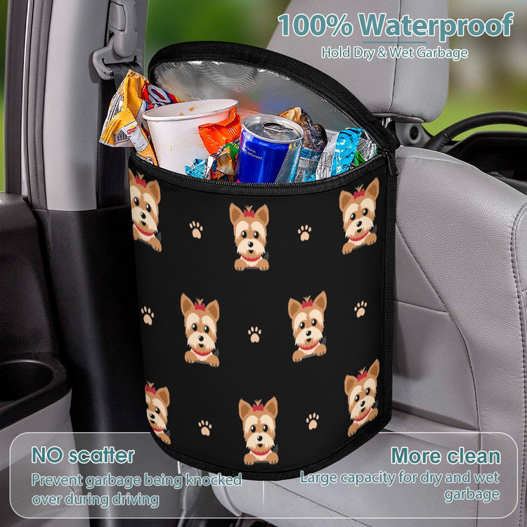 Designed with both Yorkies and people in mind, this delightful car storage bag brings you the best of function and sentimentality. Showcasing the cutest Yorkies with their captivating black eyes, charming red bows, and delightful paw highlights on a sleek black background, it's the ideal blend of usefulness and cuteness.