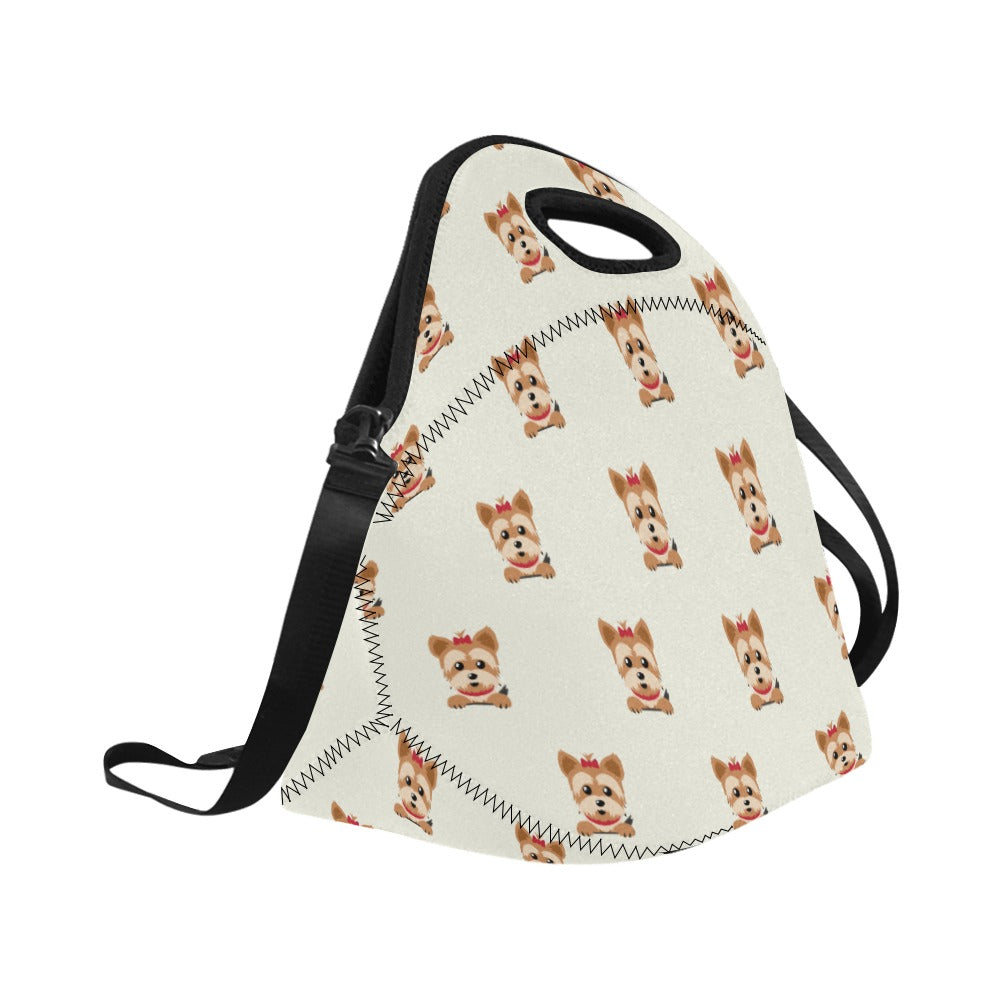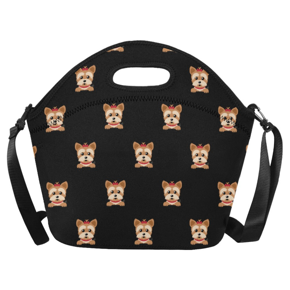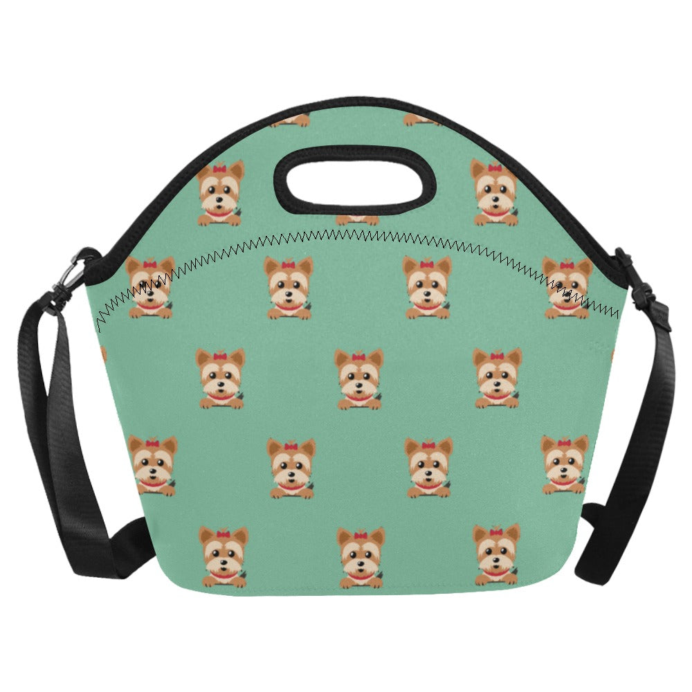 Celebrate your love for your Yorkshire Terrier with our My Yorkie My Love Neoprene Lunch Bag! This delightful bag features a charming pattern of cartoon-style Yorkshire Terrier faces, each adorned with a playful red bow, bringing joy to every meal.