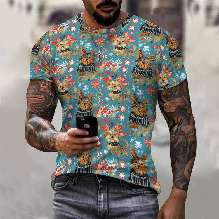 Celebrate the season with the Yuletide Yorkies Christmas Men's Cotton T-Shirt, a heartwarming tribute to Yorkshire Terrier lovers.