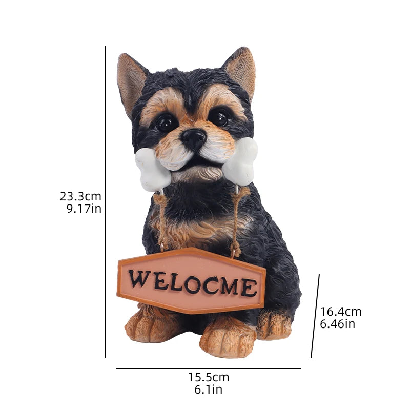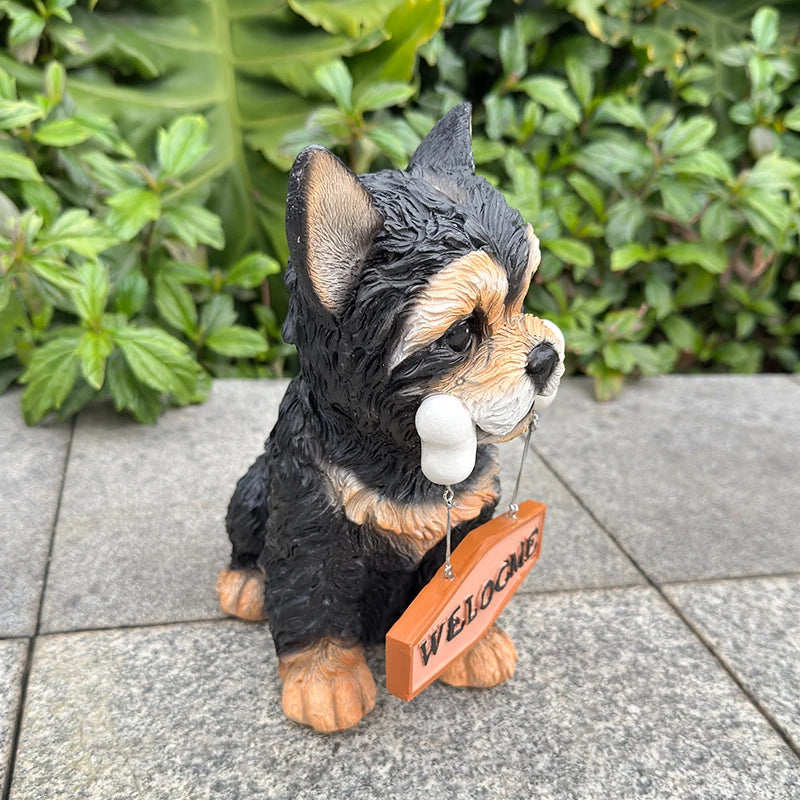 This resin statue features a Yorkie holding a bone in its mouth, complete with a cheerful "Welcome" sign. It’s a perfect addition to your garden, patio, or entryway, spreading joy and warmth to every visitor.