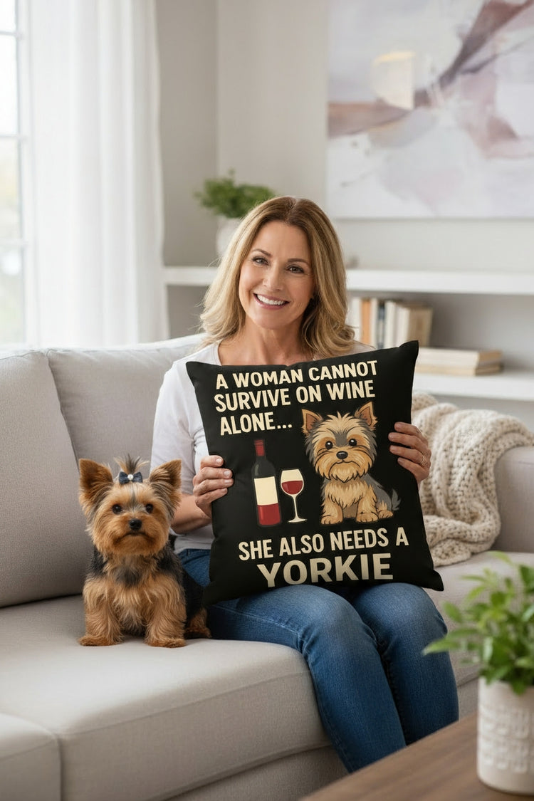 Personalized “A Woman Cannot Survive on Wine Alone…” Yorkie Pillowcase