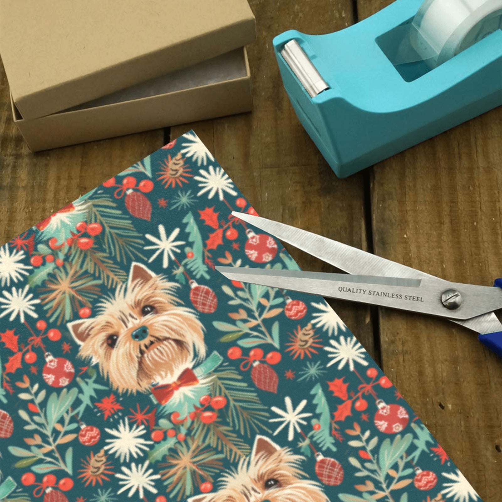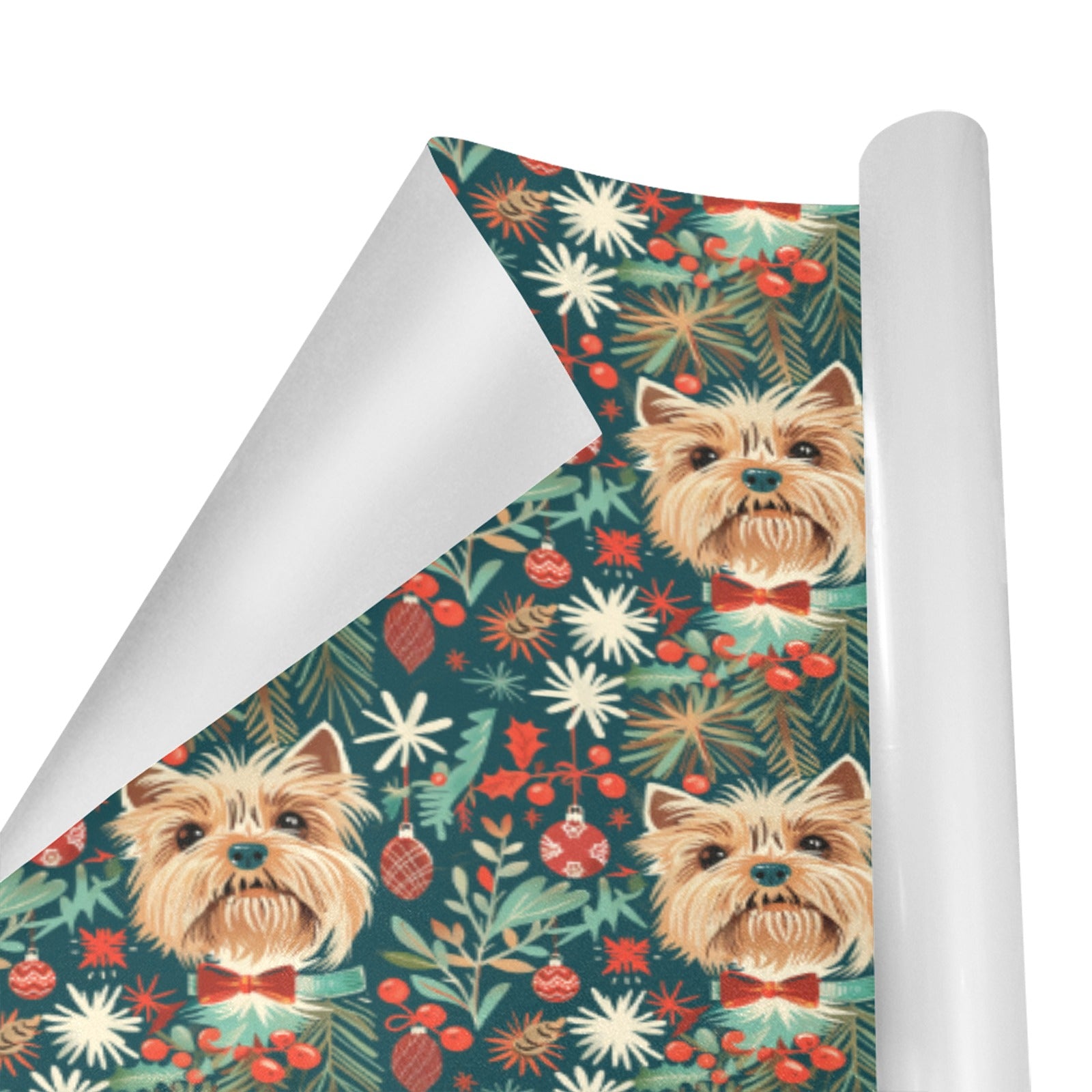 This delightful design captures the festive spirit through the twinkling eyes of a Yorkshire Terrier, making every present feel special.