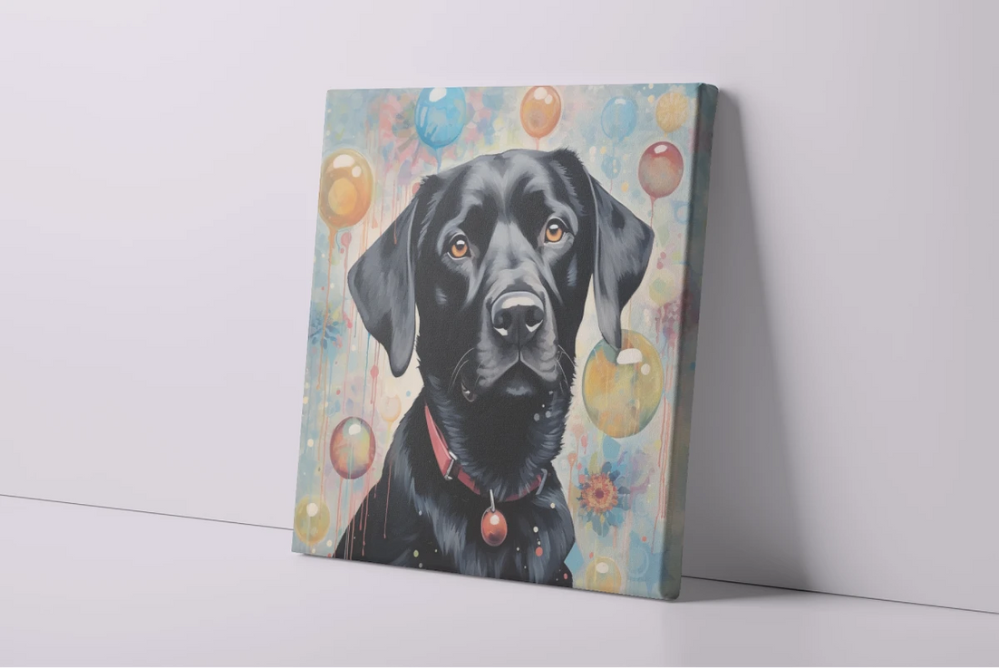 A beautiful representation of the Black Labrador's friendly nature and emotional intelligence. This artwork showcases a glossy black coat and soulful eyes of a Labrador set against a backdrop of whimsical balloons floating in a dreamy, pastel sky. The reflective surfaces and subtle hues of the balloons infuse the portrait with a sense of joy, festivity, and magical wonder.