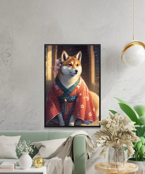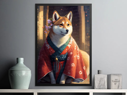Adorn your walls with the elegant Blossom Kimono Shiba Inu Wall Art Poster, a celebration of Japanese culture and canine charm.
