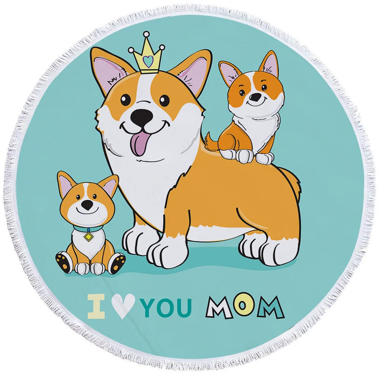 Cartoon Corgi Mom and Babies Round Beach Mat Pool Chair Cover