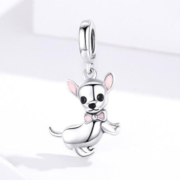 Handmade with pure 925 sterling silver, featuring the cutest silver Chihuahua with pink ears and a pink bow tie.