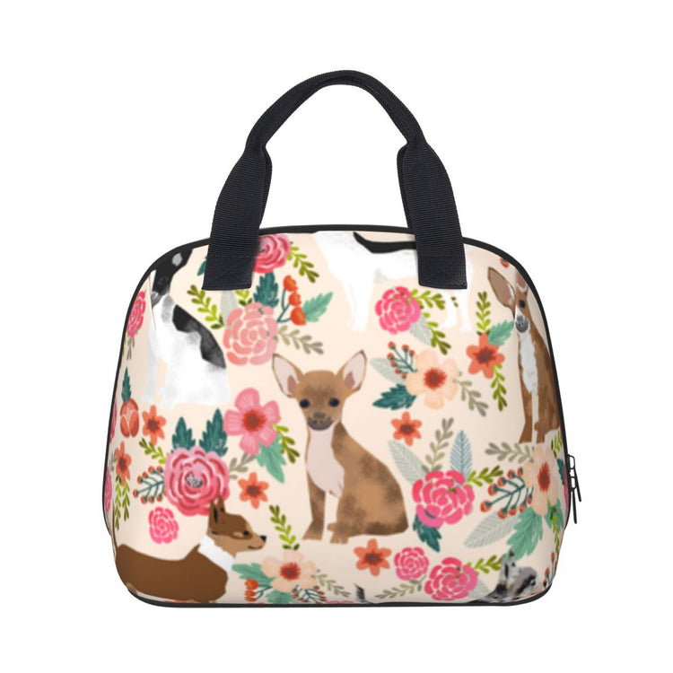 With easy-to-carry handles, zip closure, three-layer insulation, and featuring the cutest Chihuahuas in bloom design.