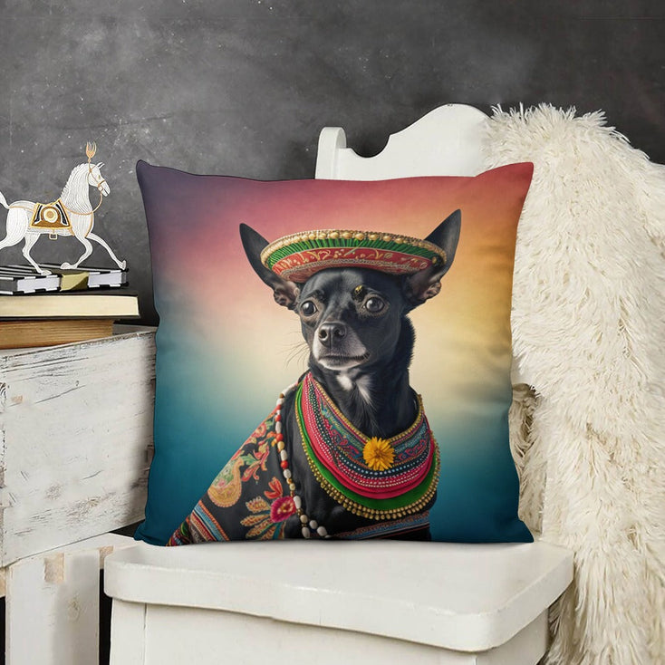 The addition of a beaded necklace with a bright yellow flower accentuates the ensemble, offering a playful contrast to the dog's sleek black coat. This pillow case is not merely an item of decor; it's a Chihuahua Decor celebration of heritage, capturing the essence of a culture that is rich in history, color, and life.