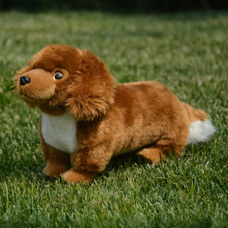 Embrace the unmistakable allure of the long-haired red Dachshund with our standing plush toy.