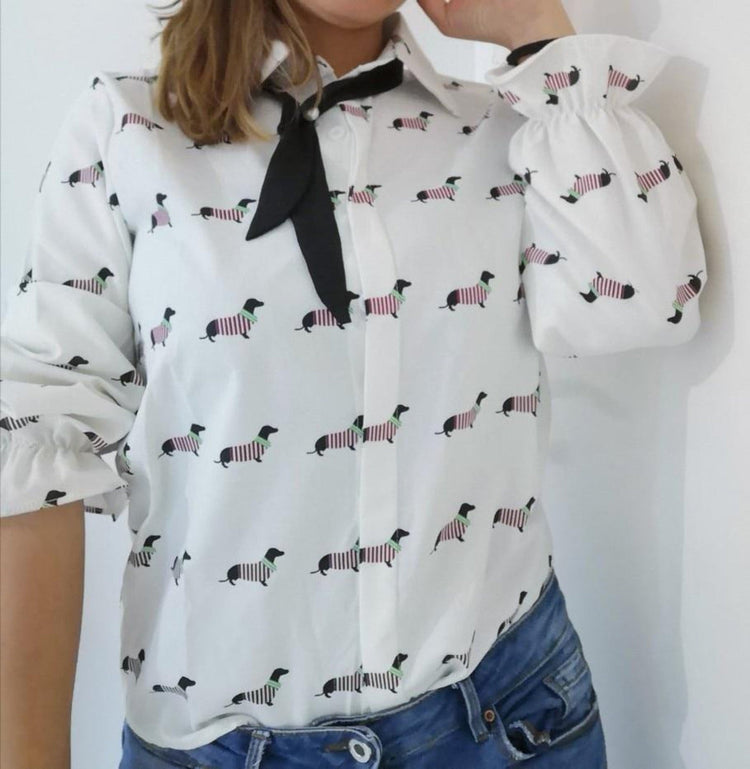 Made of soft chiffon, featuring a most adorable infinite Dachshund print, with long flare sleeves and a turn-down collar.