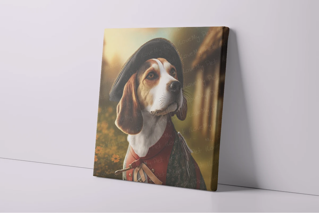 This exquisite piece of art features a Beagle, a breed with deep roots in the English countryside, dressed in an attire reminiscent of the Elizabethan era.