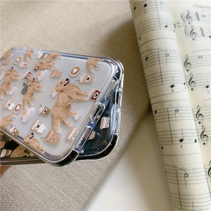 Made with high-quality silicone, lightweight, dirt-resistant, shock-proof, and featuring the cutest Golden Retrievers and coffee cups design.
