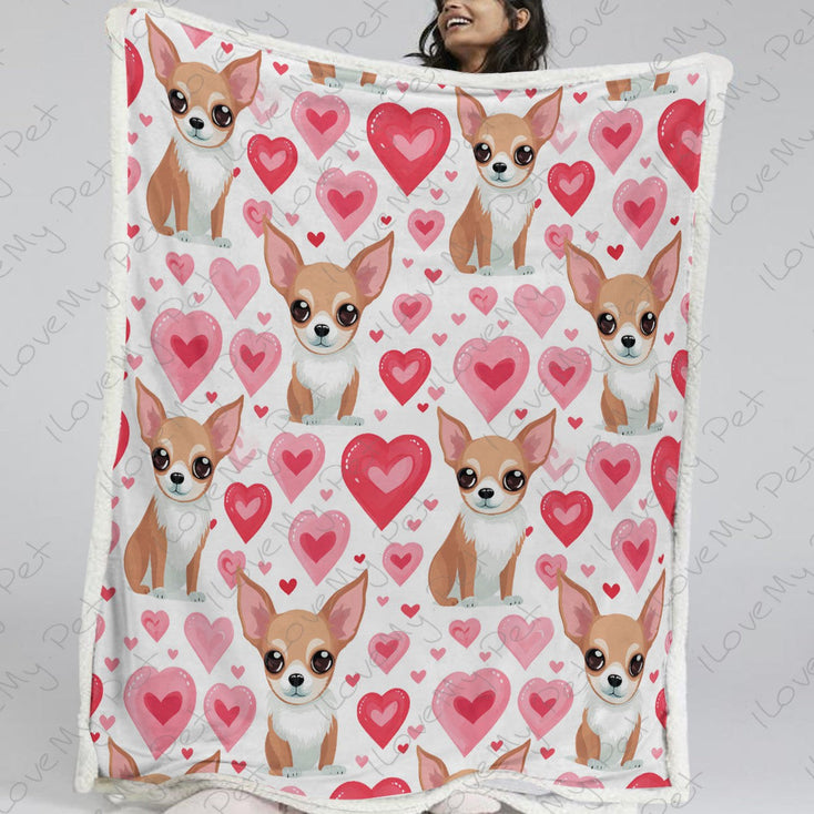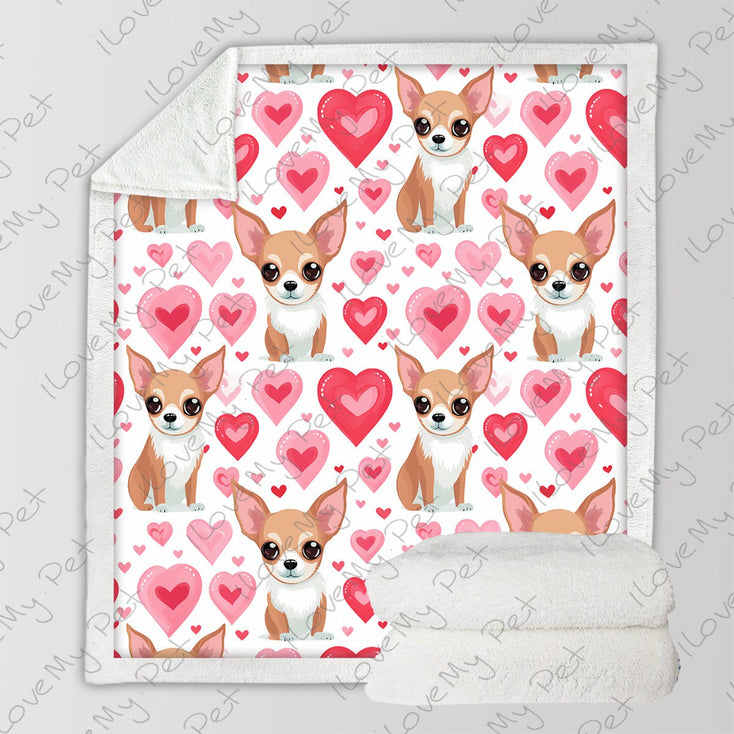 Known for their big personalities packed into tiny frames, Chihuahuas bring immeasurable joy and spunk to any household. Our fleece blanket perfectly captures the charm and whimsy of fawn and white Chihuahuas, accented with vibrant pink hearts. It's a work of art designed with both Chihuahuas and people in mind, acting as a visual and tactile expression of your affection for these lovable companions.