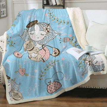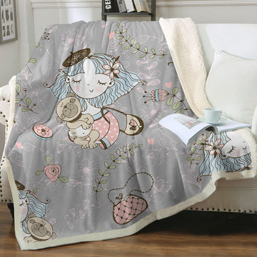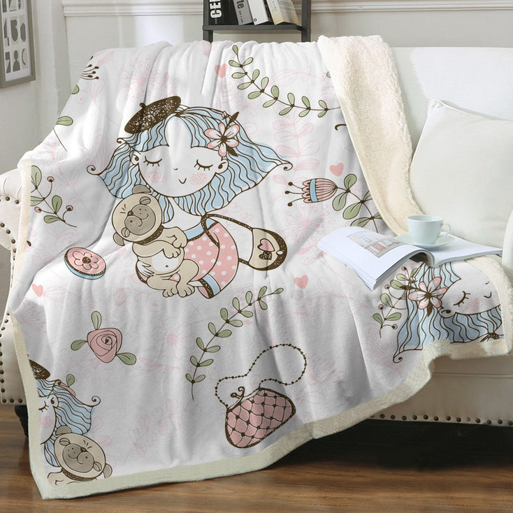 This blanket showcases a beautiful girl holding her Pug, both radiating love and affection. The heartwarming design captures the bond between a girl and her furry companion. Adorned with pink roses and flower highlights, it adds a touch of beauty and elegance to the overall design.