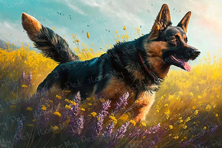 This striking piece of art captures the essence of the German Shepherd, a breed celebrated for its intelligence, loyalty, and versatility. The dog is beautifully rendered in its iconic tan and black coloration, with an alert expression and dynamic stance that bring the image to life.