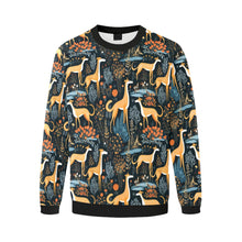 This enchanting sweatshirt features a moonlit botanical haven where Whippets grace the canvas with their slender, statuesque forms. Their sleek silhouettes stand tall amidst a rich tapestry of flora, depicted in a color palette that marries the warmth of autumn with the deep blues of twilight.
