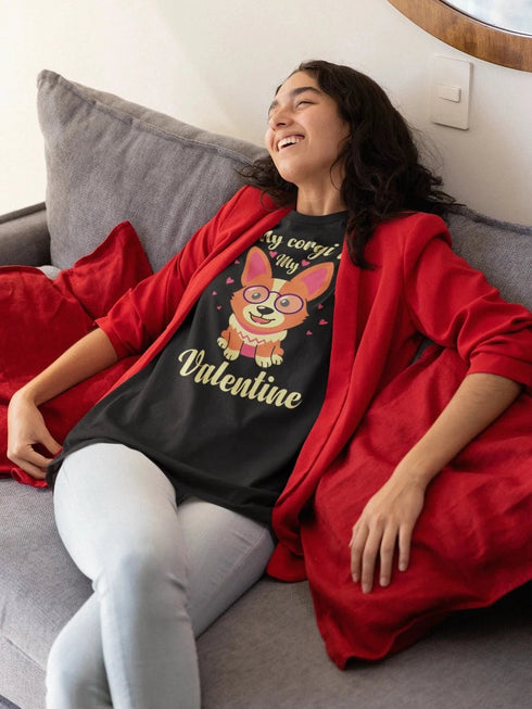 Made from 100% high-quality cotton, this t-shirt is soft, breathable, and perfect for everyday wear. With a classic fit and stylish design, it's sure to become a staple in your wardrobe. Featuring a playful and eye-catching "My Corgi is My Valentine" design, this Corgi shirt is sure to become your new favorite!