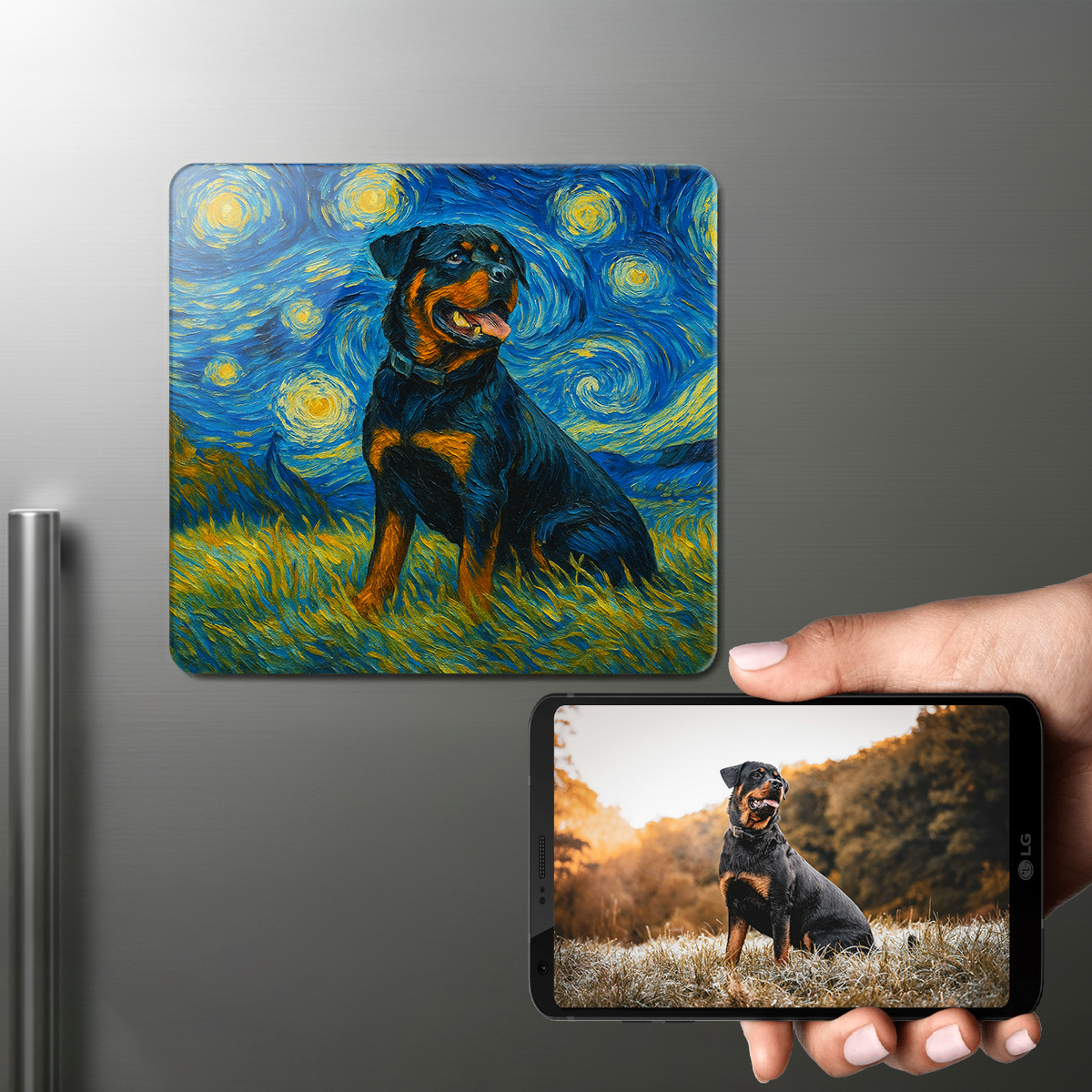 Transform your love for your Rottweiler into a stunning piece of art with our Personalized Starry Night Artwork — Custom Dog Fridge Magnet. This unique magnet brings joy to your kitchen, celebrating the bond you share with your furry friend.