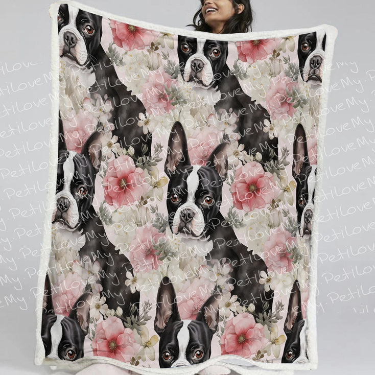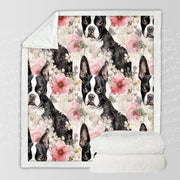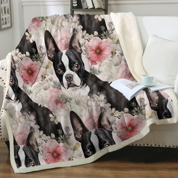 Designed with both Boston Terriers and people in mind, this exquisite blanket serves as a work of art that captures the endearing and playful nature of Boston Terriers. It showcases a captivating blend of pink and white flowers, masterfully arranged around adorable Boston Terrier figures. The gentle brushstrokes breathe life into the scene, evoking a sense of joy and beauty.