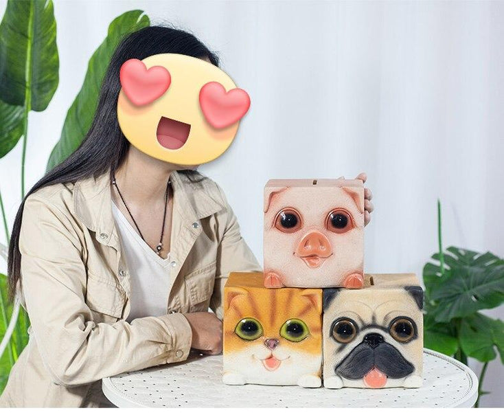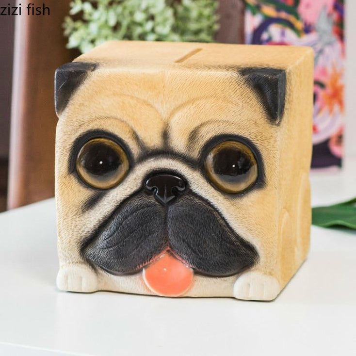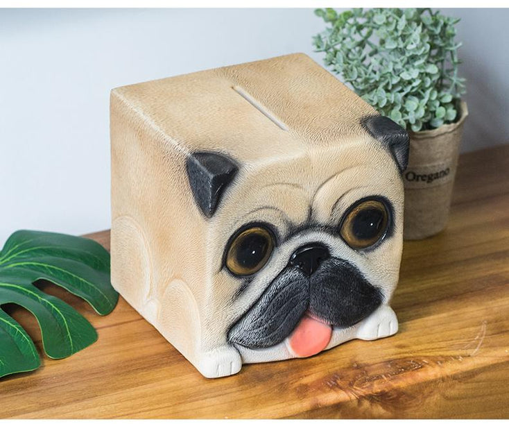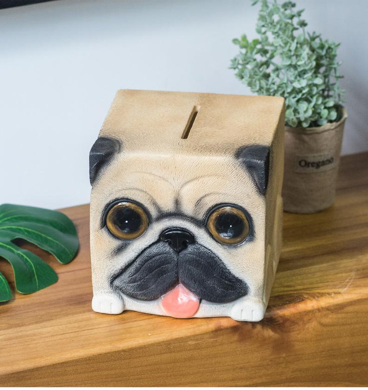 Shaped as a perfect cube, featuring the cutest smiling fawn Pug design. Encourage young savings in the cutest possible way with this one-of-a-kind Pug themed square-shaped piggy bank for kids.