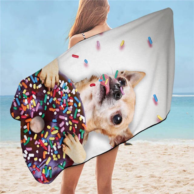 Made of super-soft and absorbent microfibre fabric, and featuring a super Chihuahua eating a large and colorful sprinkled doughnut design.