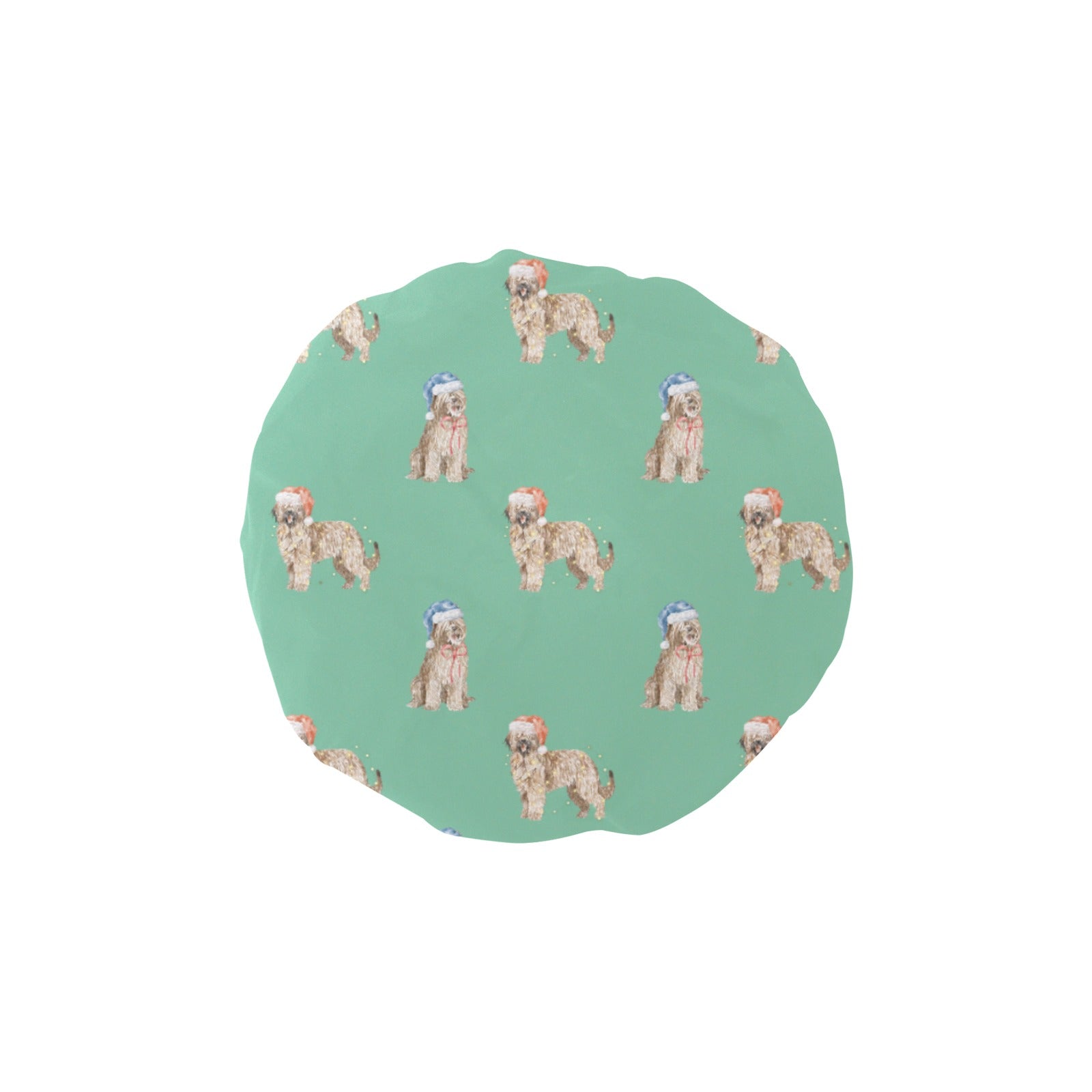 Featuring a beautiful watercolor Christmas pattern of the Briard, these shower caps showcase the breed’s elegant fawn-colored coat adorned with red and blue hats, scarves, and festive accessories like lights.